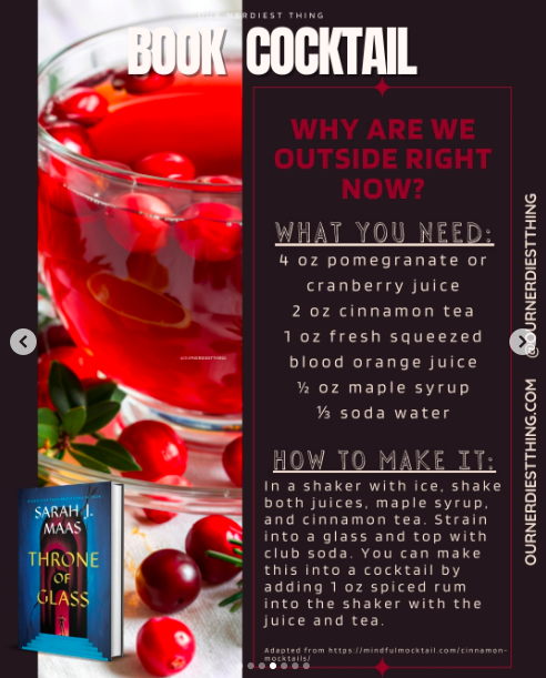 Enjoy this festive mocktail as you listen to Episode 21 - Beat You So Bad, It’ll Hurt Your Feelings! This season’s Book Club covers Throne of Glass by Sarah J Maas. This mocktail is brought to you by Whitney!